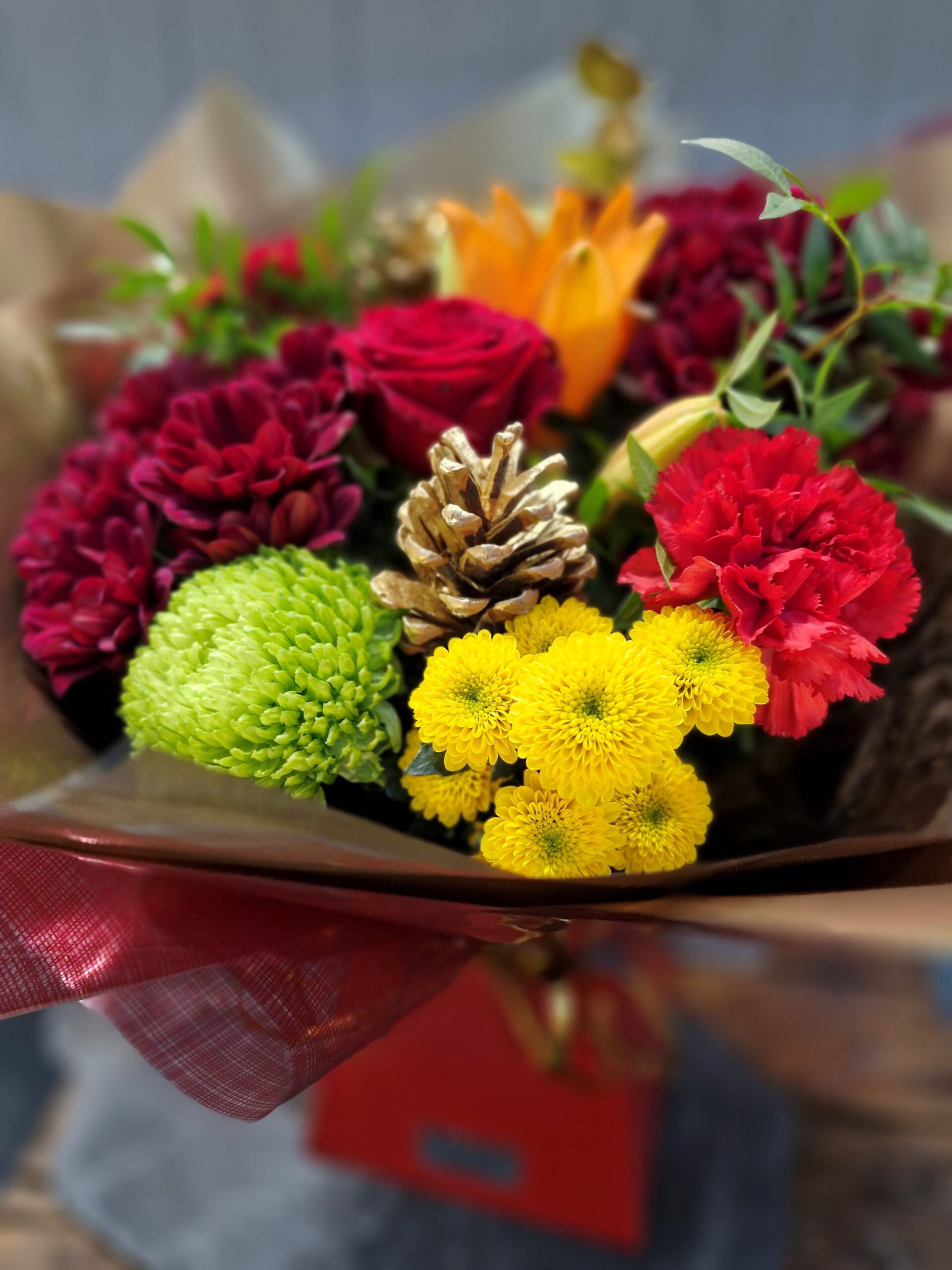 Florist choice of seasonal florals in yellow, reds,oranges greens and golds.