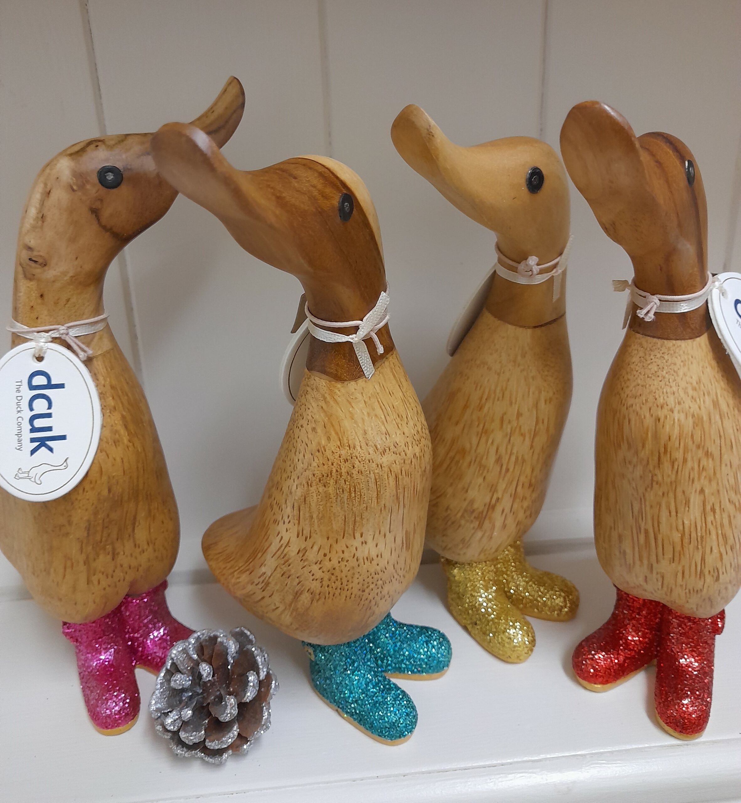 Lovingly carved from bamboo root and hand painted by skilled artisans our Disco Ducklings are wearing their Glitter wellies and ready to shake their tail feathers !