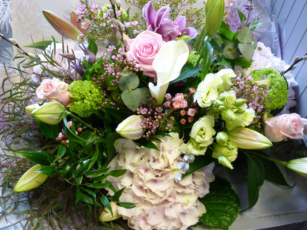 Luxury bouquet of gentle pinks and ivory white, using the finest stems including lilies and roses.