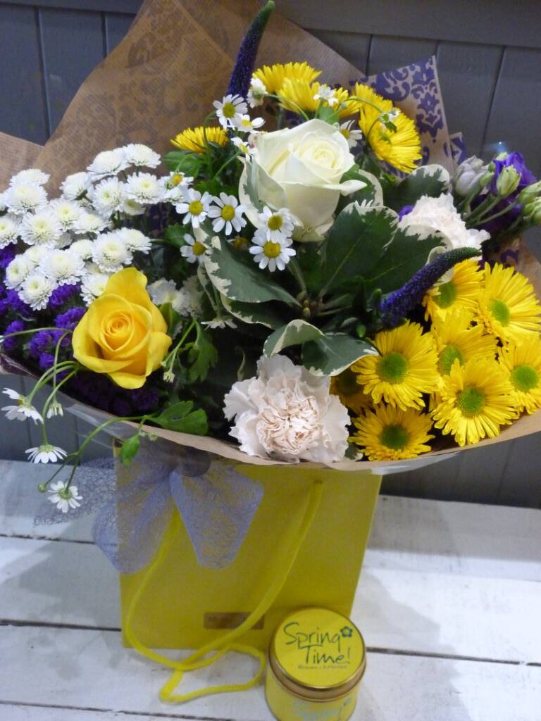 A bright Spring coloured bouquet in shades of yellow, white and purple, using the best mixed seasonal blooms , hand chosen by our Florist for you, tied aqua style and presented into a Gift bag. Your Floral gift is completed with a beautifully scented Candle by “Lily Flame”. (Flower variety will differ to image shown, Florist Choice)