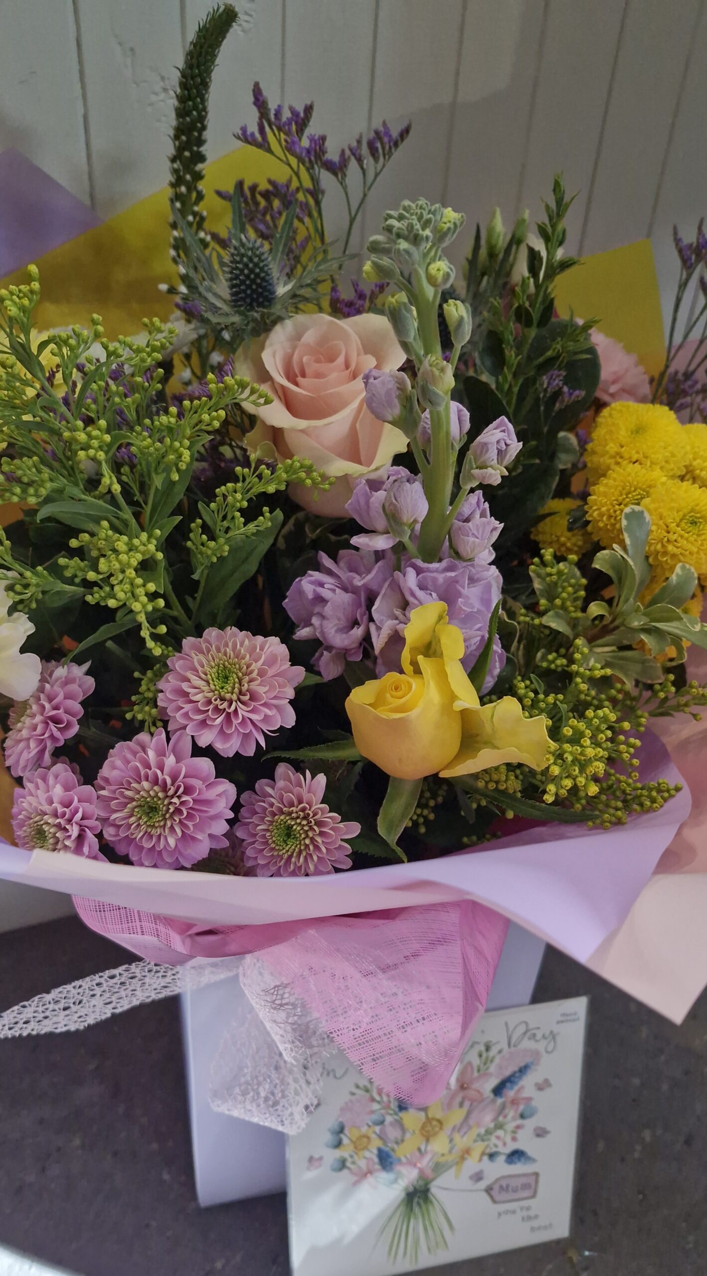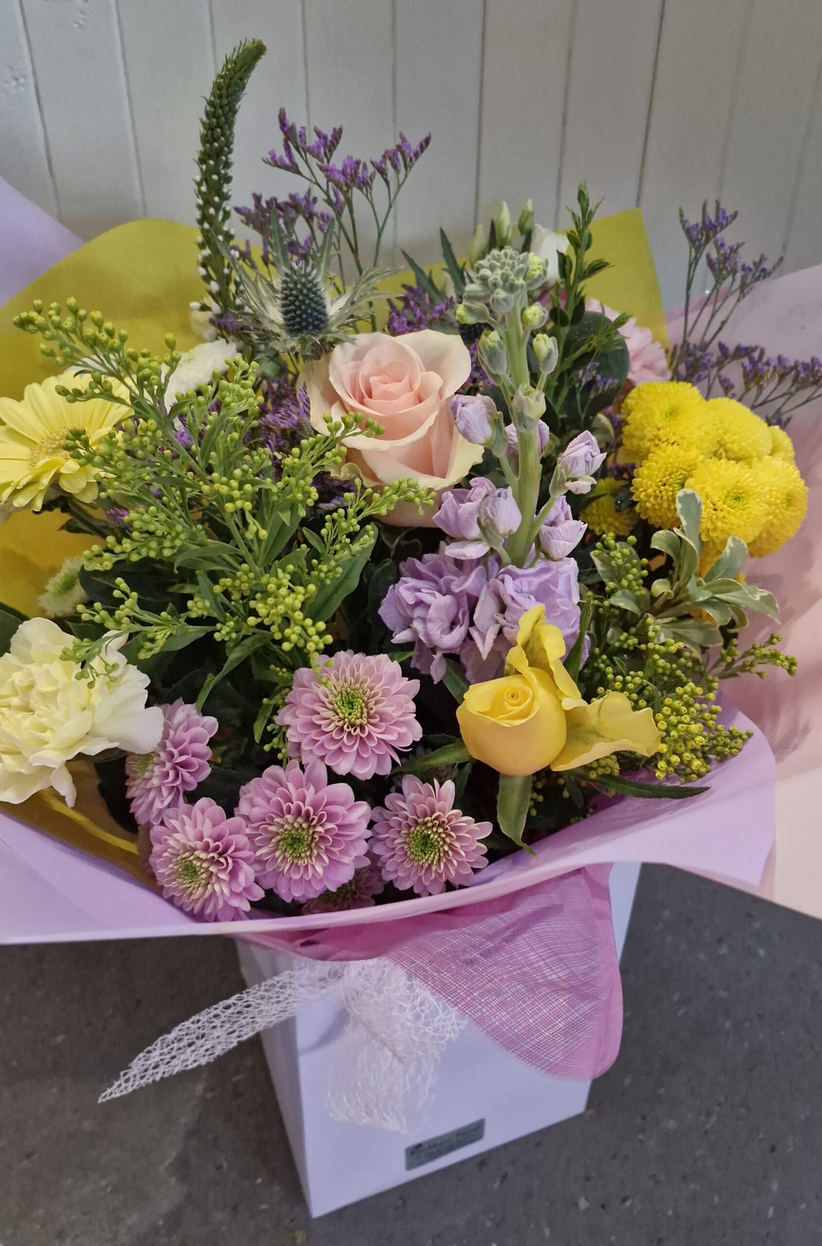 Our Florist will handpick beautiful blooms in this pretty spring pastel colour scheme, tie and present aqua style into a giftbag for you.